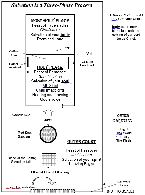 Salvation is a three-part process. This makes sense because man is a trichotomous being. We are composed of body, soul and spirit.2 In the salvation process, first is the salvation of your spirit, then the salvation of your soul. Finally—at the resurrection—you receive the salvation of your body. God in His great wisdom portrayed these three phases of salvation for us in type form in the Tabernacle in the Wilderness.3