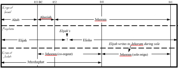 The above chart will help us to visualize the various reigns and events more clearly. The next event recorded in 2 Kings is the sky ride of Elijah. It occurred sometime during the reign of Jehoram, king of Israel (reigned 852-841 B.C.), but sometime before the death of Jehoshaphat, king of Judah. In other words, Elijah went up by the whirlwind no earlier than 852 and absolutely no later than 848 B.C. How we can know that with certainty will now be explained.